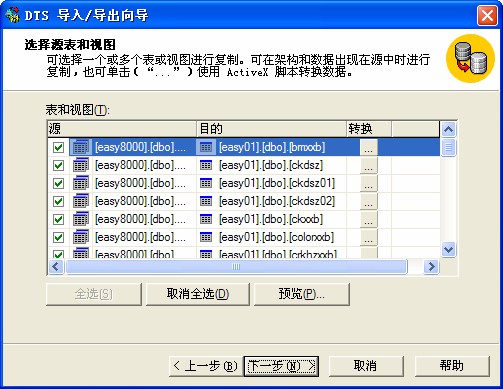 选择从数据库复制表和视图。
