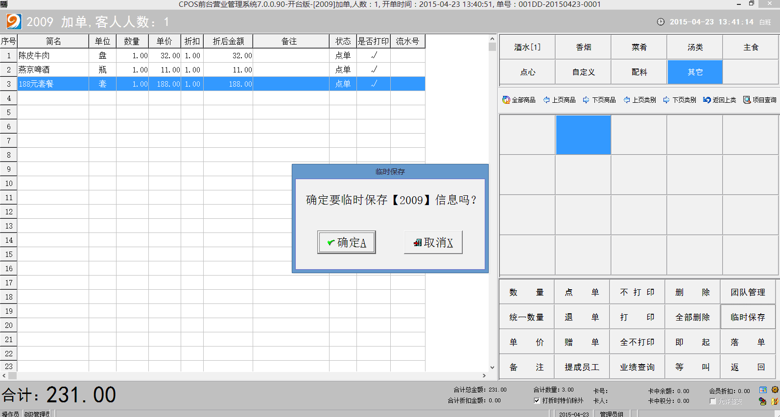 餐饮休闲CPOS前台--如何临时保存及调入临单