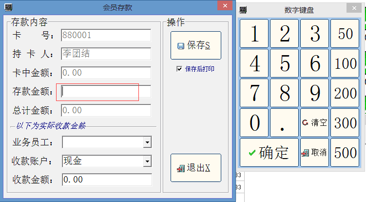 输入存款金额,可选择业务员工,以便于计算存款的业务员工的提成。