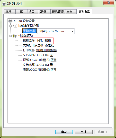 注意:设置后只要打印机打印,就会打开钱箱。