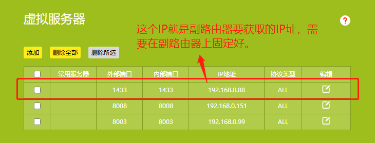 1.在客户端进入主路由器,设置主路由器转发IP及端口号(必须在副路由器中固定)如下图: